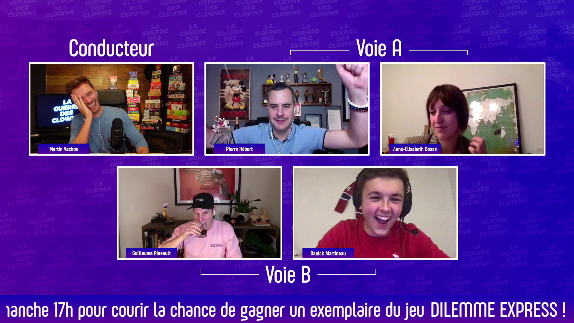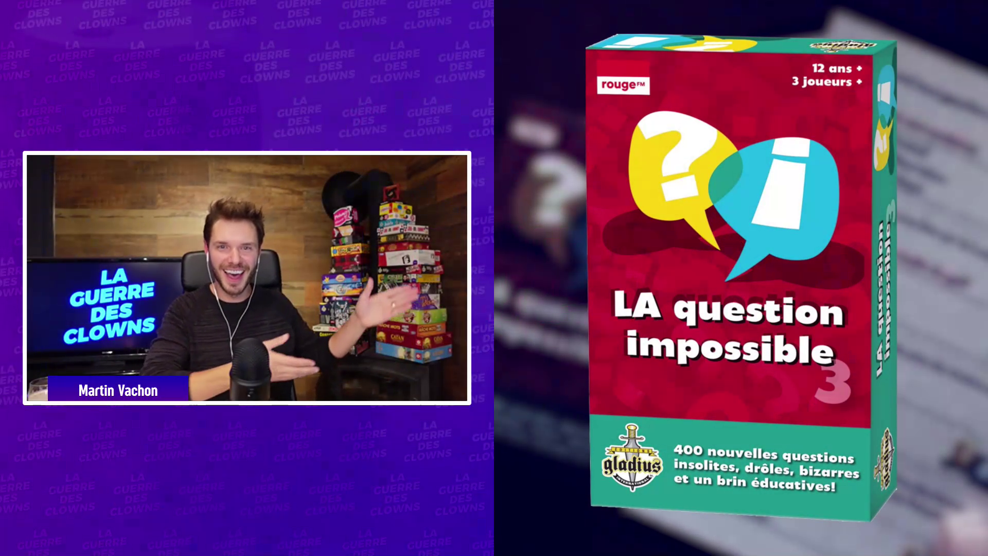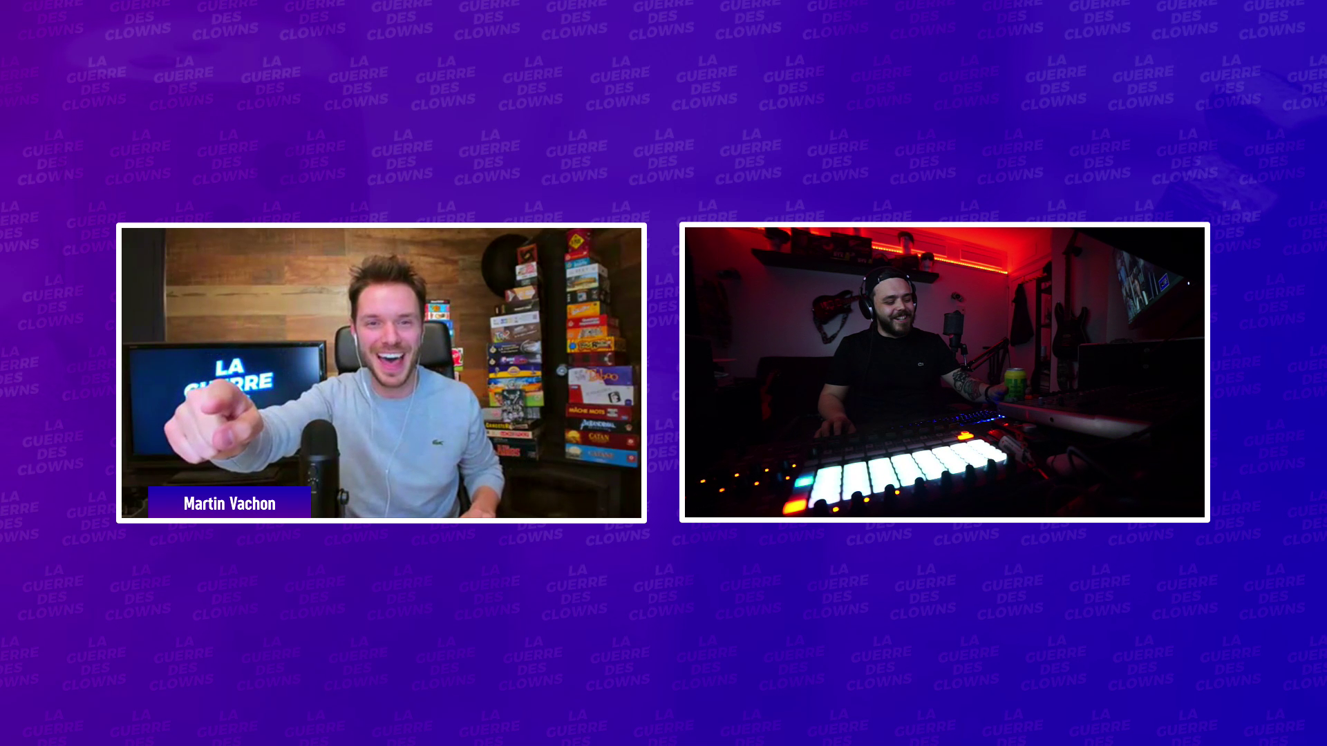 En collaboration avec l’humoriste Martin Vachon, j’ai eu l’occasion de réaliser un projet innovant intitulé la “Guerre des Clones” en direct sur Facebook. Ce projet a vu le jour en réponse à la pandémie, lors du confinnement. Martin Vachon a développé un concept unique où il jouait à des jeux de société en ligne avec d’autres humoristes, tandis que j’étais chargé de la partie technique et visuelle.